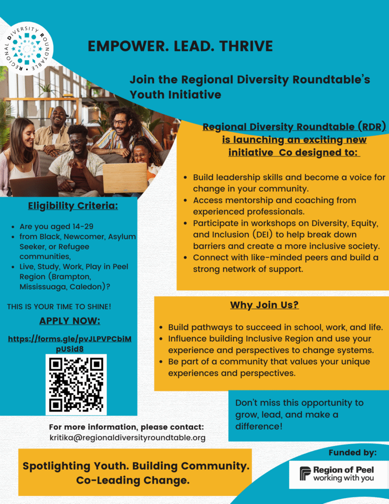 The Regional Diversity Roundtable is thrilled to announce the launch of our Youth Leadership Initiative, a transformative program designed to empower young individuals aged 14–29 from Black, Newcomer, Asylum Seeker, and Refugee communities in the Peel Region (Brampton, Mississauga, Caledon). This initiative aims to foster leadership, mentorship, and community engagement among youth, equipping them with the tools to become voices for change. Through this program, participants will: